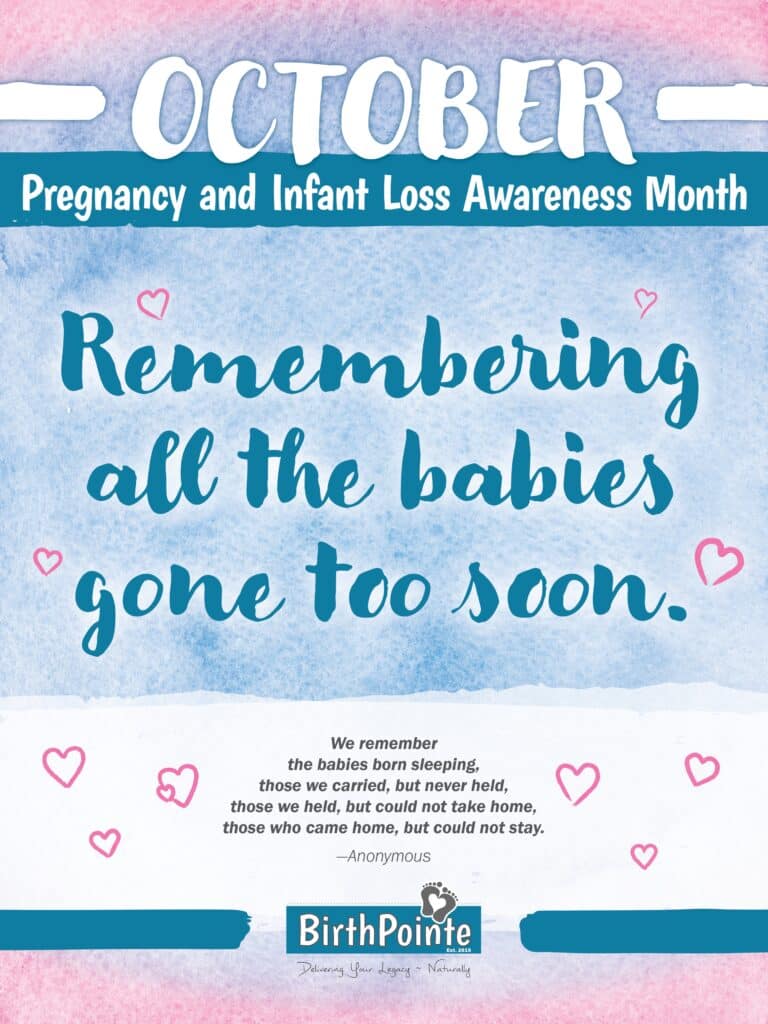 In honoring all the families who have experienced perinatal or infant losses, we invite you to join us on October 11th from 2-4pm at BirthPointe, as we prepare boxes with items that may be helpful for a mom experiencing a first, second, or third trimester loss. The intention is to give these boxes to any mom from the birthing community that is in need throughout the coming year. We will also have resources for those that have lost a baby, whether a long time ago or recently.
